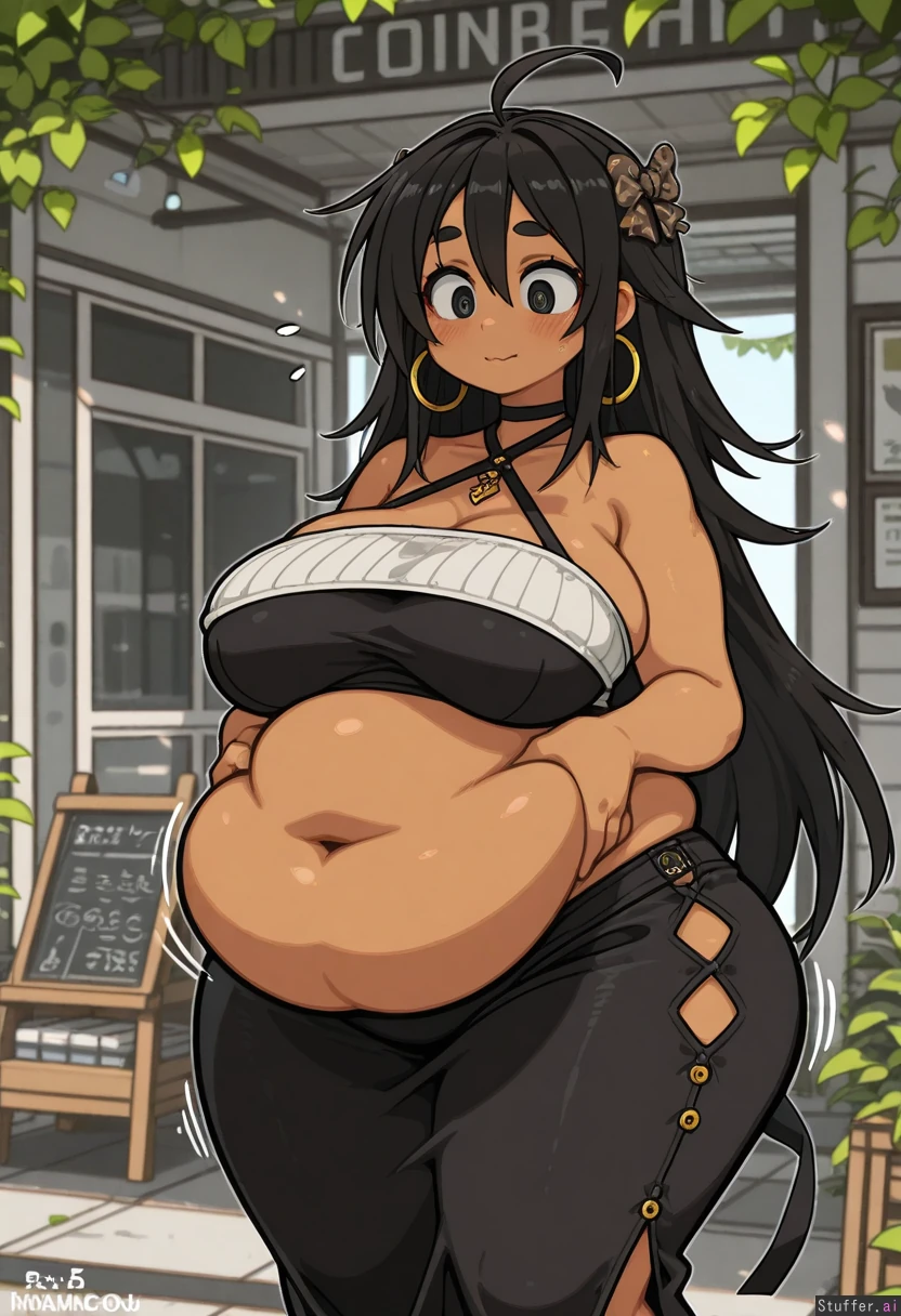**base** realistic lighting, clean outlines, solo **artist** (nancou) **character** native amazonian, 25 years old, dark skin, long flowing hair, detailed belly button, hairbows, pubic hair, heavy blush, wide eyes, looking at her belly, **clothes** lowleg long tight skirt, sideboob halter top, hoop earrings **settings** downtown garden, dappled sunlight, outdoor gift shop, **body** (Massive plump thighs:1.4), (hyper wide hips:1.4), (huge fat love handles:1.3), (huge fat deep navel:1.3), (hyper massive bottom heavy), (wide plump waist), (body weight gain expansion:1.1), sagging belly, (huge fat ass), (fat legs), (fat arms), chubby face, massive body expansion