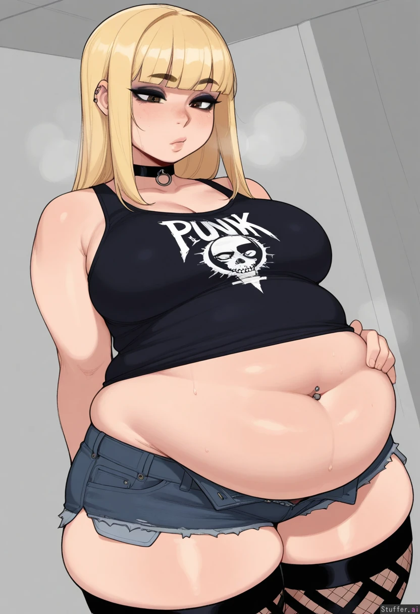 (long blonde hair), blunt bangs, choker, tank top, sleeveless, solo, ((high quality, high detail)), krekkov(artist), KAMII MOMORU(artist), (detailed face), (eyeliner), (((punk))), (navel piercing), (((midriff peek))), (unzipped shorts), thigh highs, (((bottom heavy, chubby tummy, feederism, weight gain kink))), (dramatic angle)