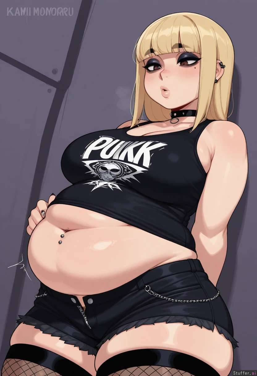 (long blonde hair), blunt bangs, choker, tank top, sleeveless, solo, ((high quality, high detail)), krekkov(artist), KAMII MOMORU(artist), (detailed face), (eyeliner), (((punk))), (navel piercing), (((midriff peek))), (unzipped shorts), thigh highs, (((bottom heavy, chubby tummy, weight gain kink))), (dramatic angle)