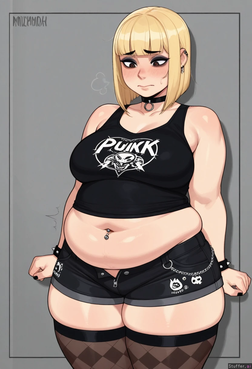 (long blonde hair), blunt bangs, choker, tank top, sleeveless, solo, ((high quality, high detail)), krekkov(artist), KAMII MOMORU(artist), (detailed face), (eyeliner), (((punk))), (navel piercing), (((midriff peek))), (unzipped shorts), thigh highs, (((bottom heavy, chubby tummy, massive weight gain, embarrassed))), (dramatic angle)