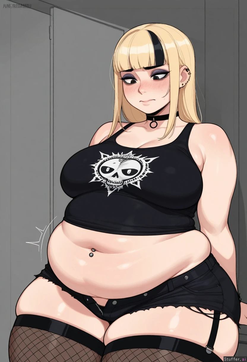 (long blonde hair), blunt bangs, choker, tank top, sleeveless, solo, ((high quality, high detail)), krekkov(artist), KAMII MOMORU(artist), (detailed face), (eyeliner), (((punk))), (navel piercing), (((midriff peek))), (unzipped shorts), thigh highs, (((bottom heavy, chubby tummy, massive weight gain, embarrassed))), (dramatic angle)