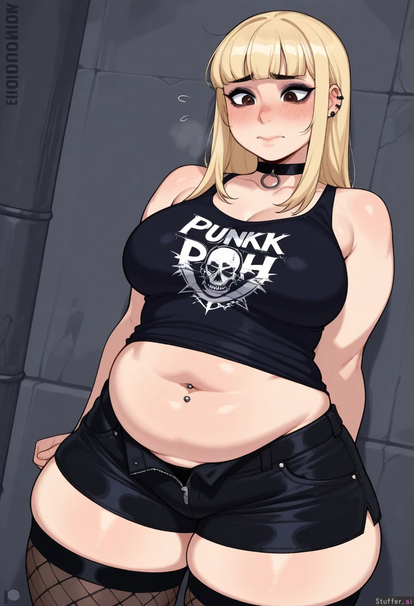 (long blonde hair), blunt bangs, choker, tank top, sleeveless, solo, ((high quality, high detail)), krekkov(artist), KAMII MOMORU(artist), (detailed face), (eyeliner), (((punk))), (navel piercing), (((midriff peek))), (unzipped shorts), thigh highs, (((bottom heavy, chubby tummy, thick hips, embarrassed))), (dramatic angle)