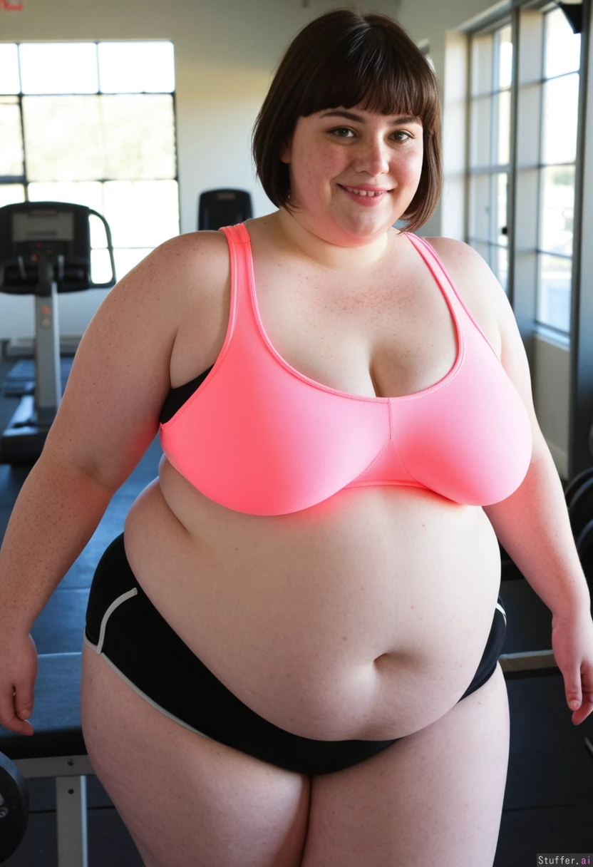 1woman, solo, alone, realism, morning light, action shot American pampered housewife, fat round face, fat double chin, full lips, freckles, bright hazel eyes, long eyelashes, short hair, dark messy hair, bangs, (very obese, obese belly, obese thighs, obese hips), Too small sports bra and workout shorts Walking out of gym, smiling