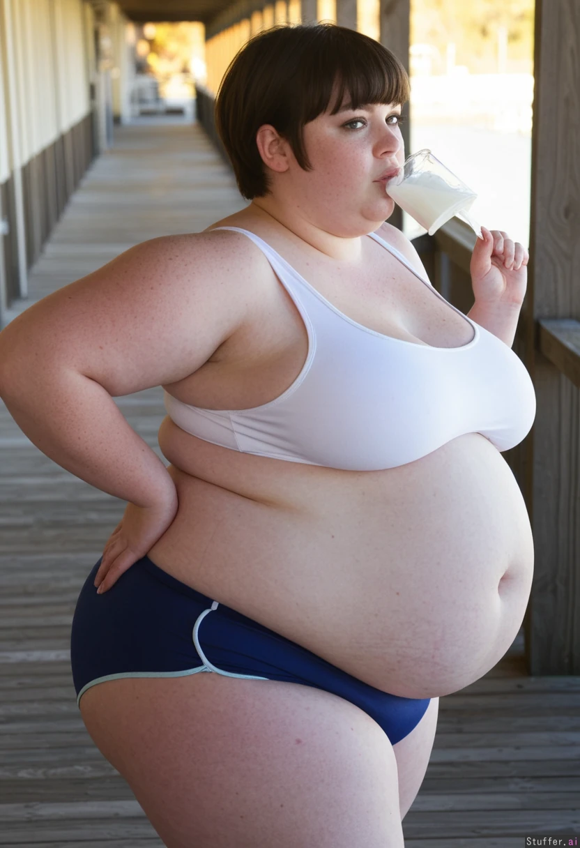 1woman, solo, alone, realism, morning light, side view American pampered housewife, fat round face, fat double chin, full lips, freckles, bright hazel eyes, long eyelashes, short hair, dark messy hair, bangs, (very obese, huge full belly, obese thighs, obese hips), Too small sports bra and workout shorts Walking down boardwalk, drinking a milkshake