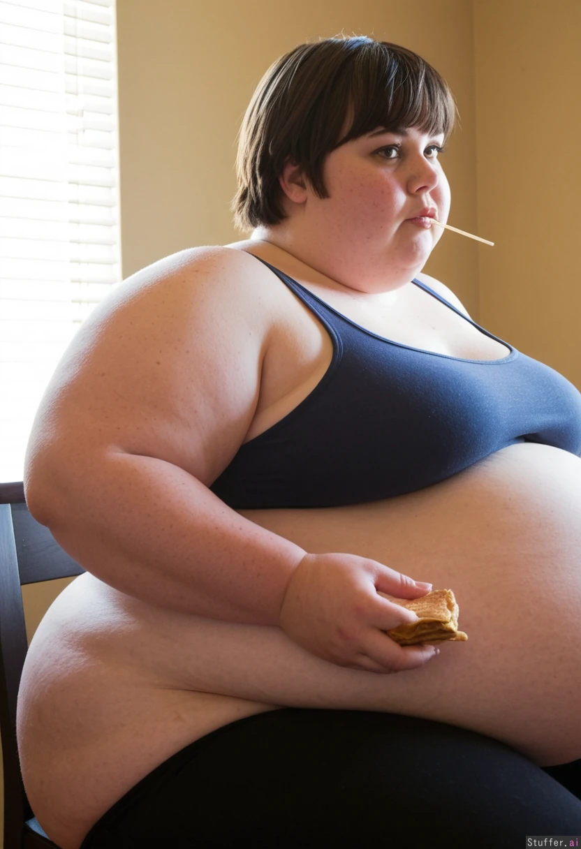 1woman, solo, alone, realism, sunlight, side view, dining room American pampered housewife, fat round face, fat double chin, full lips, freckles, bright hazel eyes, long eyelashes, short hair, dark messy hair, bangs, (very obese, obese belly, obese thighs, obese hips:1.25) Tank top and leggings Sitting at table eating pancakes