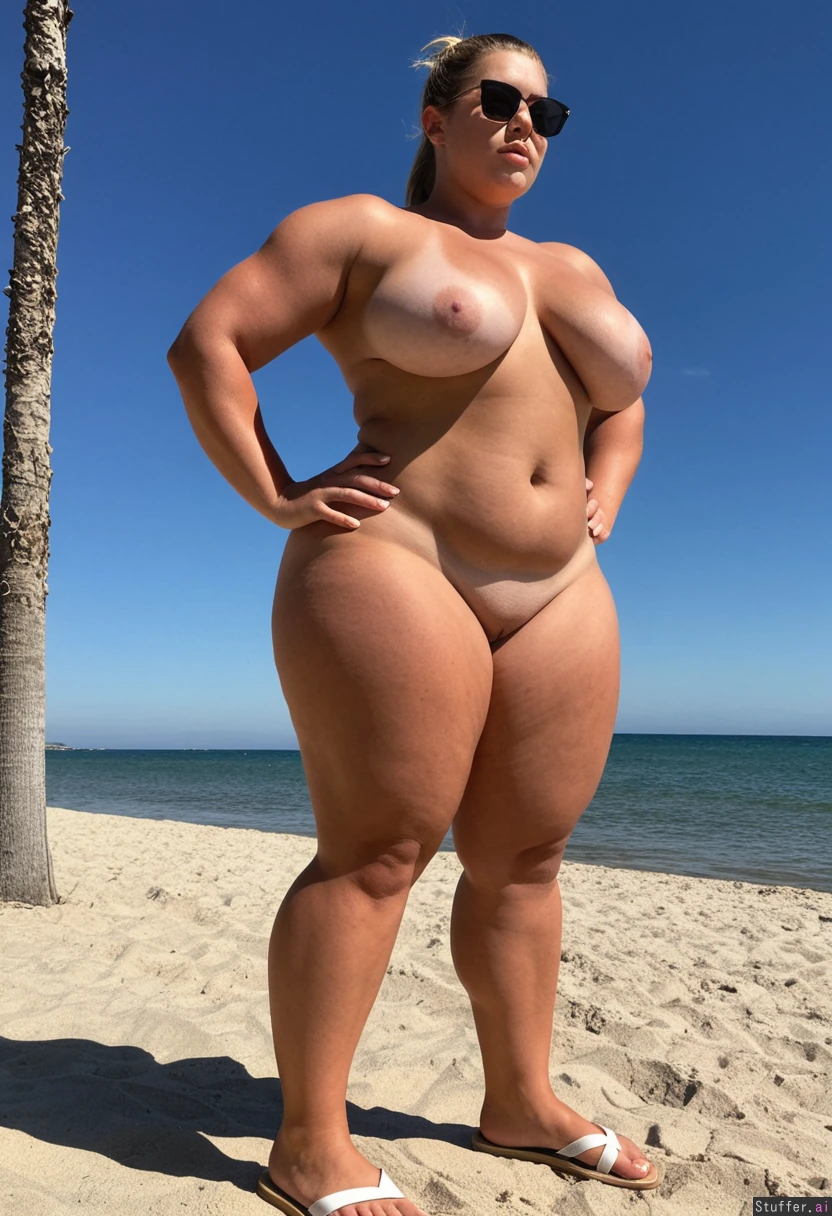 20 year old girl, beach on sunny day, brown blonde hair, sunglasses, tan lines, huge puffy lips, wide hips, (((massive chunky thighs))), standing in sun, wearing sandals, ((small perky breasts)), (((extremely hyper muscular))), (((huge muscles)))
