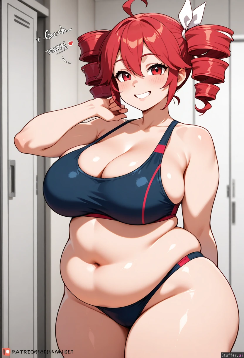 1girl, best_quality, anime, kasane_teto, ((overweight_female)), ((fat_belly)), ((wide_hips)), smile, grin, flirting, sports_bikini, (blushyspicy_\(artist\):0.4)