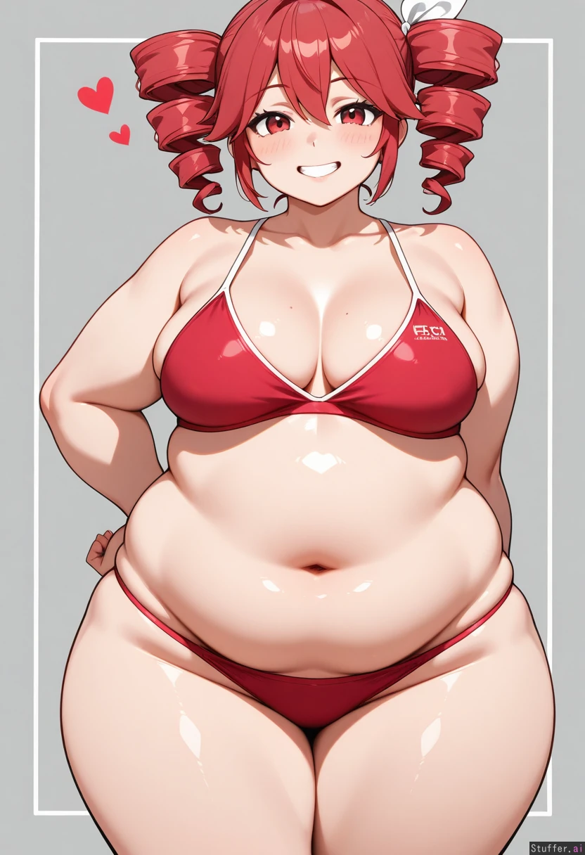 1girl, best_quality, anime, kasane_teto, ((overweight_female)), ((fat_belly)), ((wide_hips)), smile, grin, flirting, sports_bikini