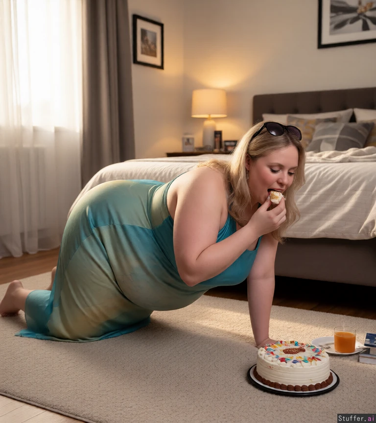 Put her on all fours eating a cake in a bedroom Slightly_chubby plump _body curvy fat_belly fat_arms obese_woman 100_pounds_gained