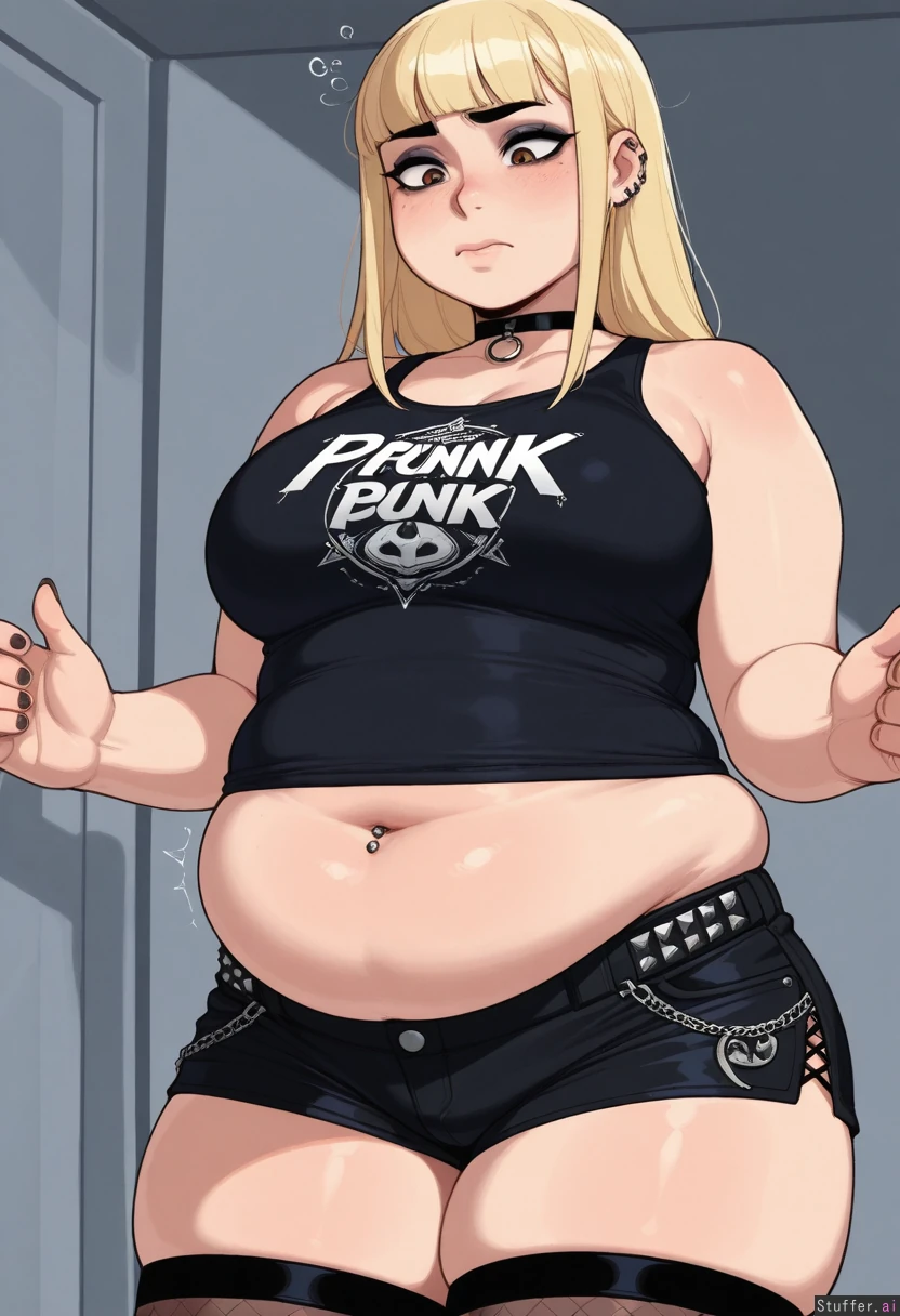 (long blonde hair), blunt bangs, choker, tank top, sleeveless, solo, ((high quality, high detail)), krekkov(artist), KAMII MOMORU(artist), (detailed face), (eyeliner), (((punk))), (navel piercing), (((midriff peek))), (trying to button shorts), thigh highs, (((chubby tummy, frustrated, belly bulge))), (dramatic angle)
