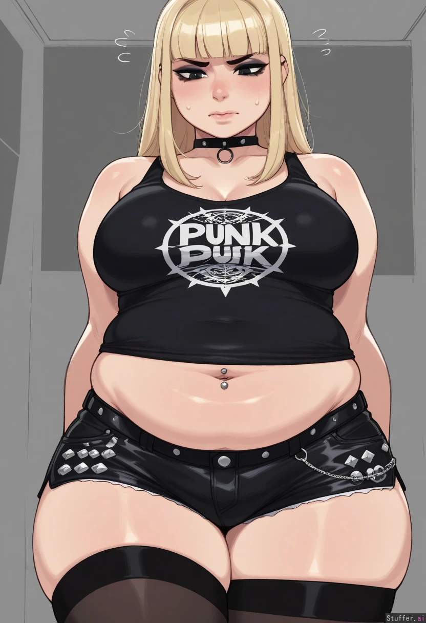 (long blonde hair), blunt bangs, choker, tank top, sleeveless, solo, ((high quality, high detail)), krekkov(artist), KAMII MOMORU(artist), (detailed face), (eyeliner), (((punk))), (navel piercing), (((midriff peek))), (trying to button shorts), thigh highs, (((chubby tummy, frustrated, belly bulge))), (dramatic angle)