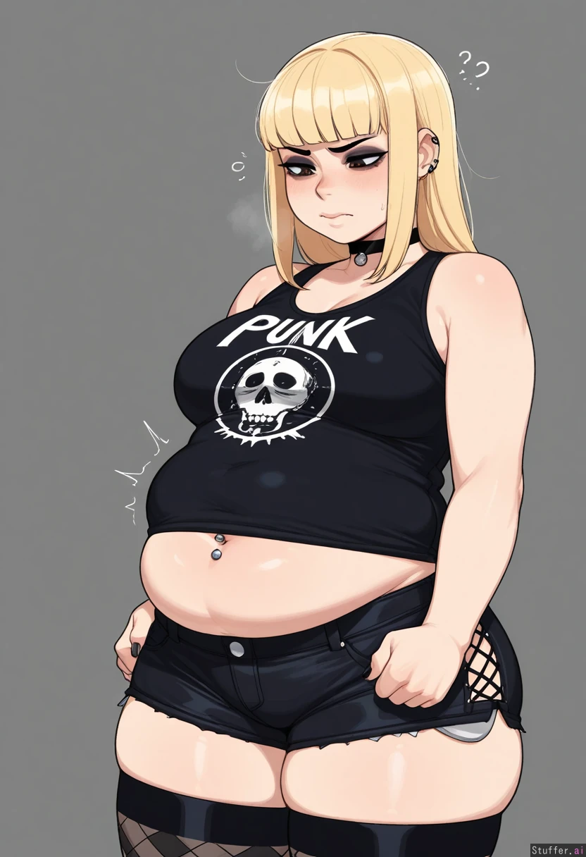 (long blonde hair), blunt bangs, choker, tank top, sleeveless, solo, ((high quality, high detail)), krekkov(artist), KAMII MOMORU(artist), (detailed face), (eyeliner), (((punk))), (navel piercing), (((midriff peek))), (cant button shorts), thigh highs, (((chubby tummy, frustrated, belly bulge))), (dramatic angle)
