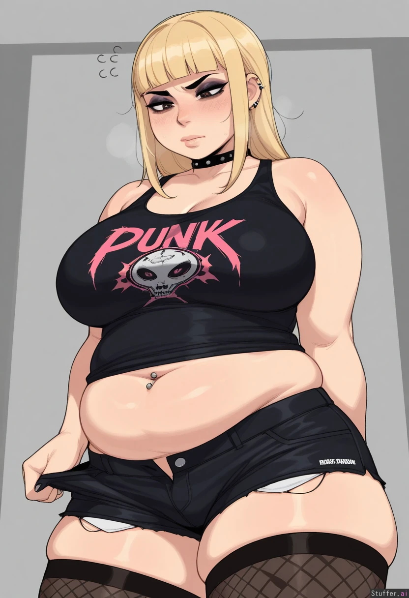 (long blonde hair), blunt bangs, choker, tank top, sleeveless, solo, ((high quality, high detail)), krekkov(artist), KAMII MOMORU(artist), (detailed face), (eyeliner), (((punk))), (navel piercing), (((midriff peek))), (unbuttoned shorts, grabbing shorts), thigh highs, (((chubby tummy, frustrated))), (dramatic angle)