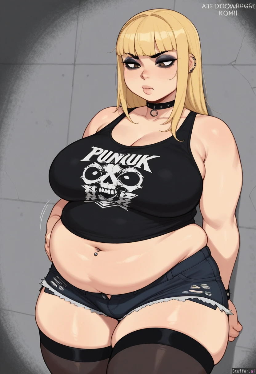 (long blonde hair), blunt bangs, choker, tank top, sleeveless, solo, ((high quality, high detail)), krekkov(artist), KAMII MOMORU(artist), (detailed face), (eyeliner), (((punk))), (navel piercing), (((midriff peek))), (unbuttoned shorts), thigh highs, (((chubby tummy, ate too much, weight gain))), (dramatic angle)
