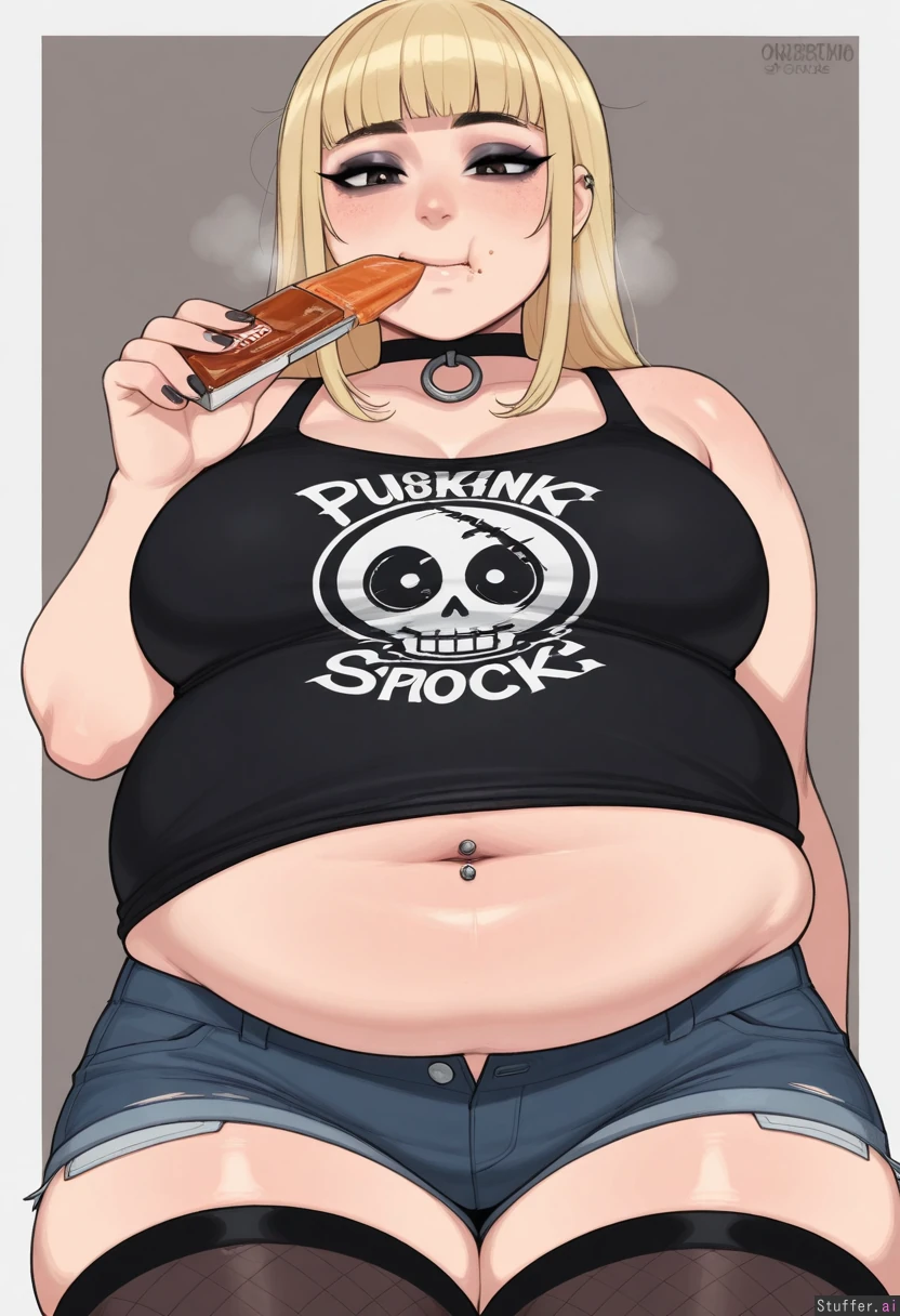 (long blonde hair), blunt bangs, choker, tank top, sleeveless, solo, ((high quality, high detail)), krekkov(artist), KAMII MOMORU(artist), (detailed face), (eyeliner), (((punk))), (navel piercing), (((midriff peek))), (unbuttoned shorts), thigh highs, (((chubby tummy, overeating, weight gain, eating_snacks))), (dramatic angle)