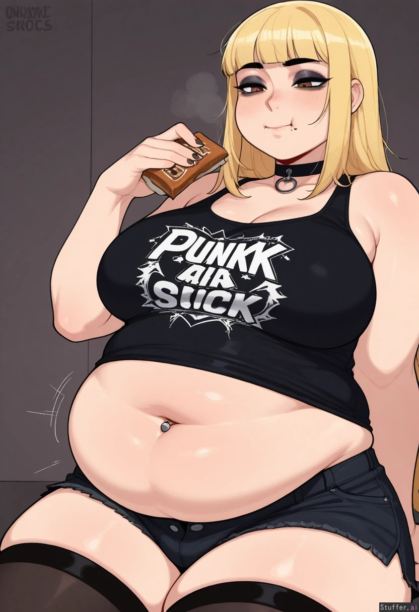 (long blonde hair), blunt bangs, choker, tank top, sleeveless, solo, ((high quality, high detail)), krekkov(artist), KAMII MOMORU(artist), (detailed face), (eyeliner), (((punk))), (navel piercing), (((midriff peek))), (unbuttoned shorts), thigh highs, (((chubby tummy, overeating, weight gain, eating_snacks))), (dramatic angle)