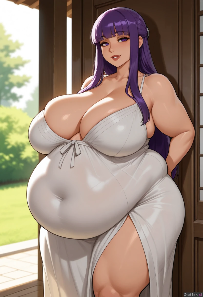 (((Hanging obese double belly))), (((sagging body))), (((huge soft fat belly))), ((huge soft belly rolls)), ((soft sagging rolls)), ((big fat enormous belly))), ((sagging belly)), (((deep cleavage))), ((big weight gain)), ((super obese)), ((ssbbw weight gain)), ((hugely obese)), ((very fat)), ((bursting out)), ((irreversibly fat)), ((aroused and horny)), ((massive fat leg with cellulite)), ((loose skin)), (nyantcha:1.3), (krekkov:1.2), (reiq:1.1), (kittew:1.1), 8k, high resolution, full resolution, maximum pixel density, best quality, masterpiece, highly detailed, flawless, high rating, highly detailed face, anime girl, solo_female, textless_version, Fern from sousou no Frieren, outside in a beautiful garden, running her hands over her curves, vibrant neutral color palette, soft cinematic lighting, medium shot, ultra-detailed, high realism, professional photography look, sharp focus, natural skin detail, 3/4 view, medium shot, standing contraposto, very flirty expression, toned arms, toned back, soft fat belly, soft legs, massive soft fat thighs, (((round plump engorged huge massive tits))), cleavage, flirting with the viewer, fair skin complexion, seductive smile, purple-haired woman, natural skin tone, long purple hair in a blowout, wavy silky texture, slim oval face, soft cheek contours, natural skin texture, neutral undertone, ((purple eyes)), long defined lashes, softly arched eyebrows, straight refined nose, full lips, bold dark red lipstick, composed confident expression, slightly parted lips, focused forward gaze, elegant neck, defined collarbones, relaxed shoulders, slender upper torso, proportional anatomy, natural posture, seductively showing off her curves, side split open dress, dress is split on side, thigh and waist spilling out of dress, side split dress, slutty white tiny dress, deep cleavage, belly cleavage, outside, walking in a beautiful garden, ((breasts_apart))