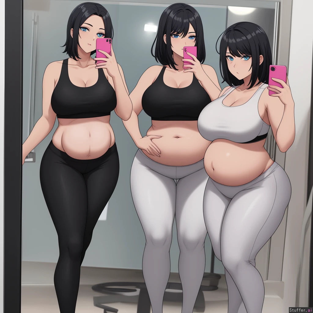 Appearance= male he has Fair skin, blue eyes, black hair Short, messy hair, Slim torso, extremely large, round, and tight pregnant belly with pinkish tones, Wide hips and thick thighs, round and plump buttocks. He is wearing She wears a white crop top and her black sports bra is visible, she wears tight black pants. She is standing in front of a mirror, holding a dark phone in one hand to take a selfie