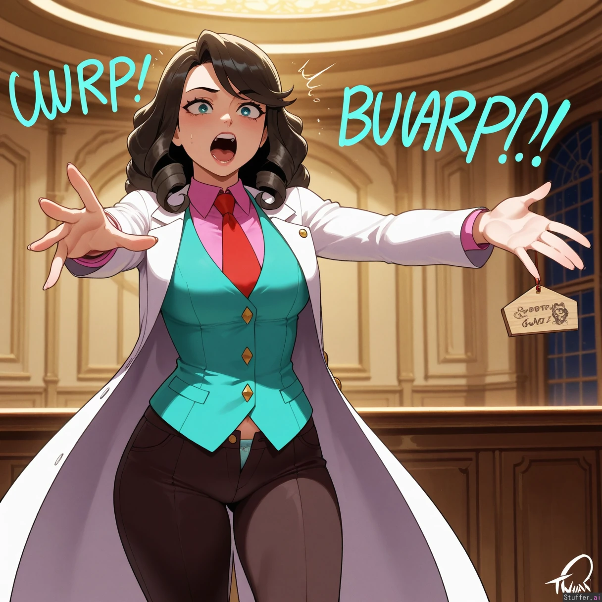 perfect anatomy, beautiful face, beautiful eyes, Masterpiece, best_quality, beautiful, vibrant colors, dim light, (1girl), alone, Tweedabop(artist), betterwithsalt(artist), nyantcha(artist), perfect hands, front view, Ema_Skye(Ace_attorney), dynamic pose, teal_eyes, white_coat, pink_shirt, green_vest_with_gold_buttons, brown_pants, capri_pants, red_tie, teal_eyes, ((burping)), overflowing_belly, unbuttoned_pants, cyan_panties, courtroom, ((wide hips, fat ass, gigantic thighs, overweight):0.5)