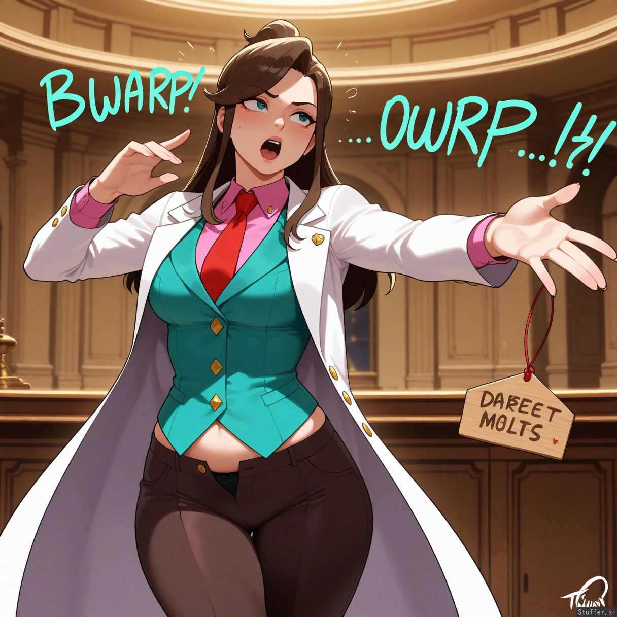 perfect anatomy, beautiful face, beautiful eyes, Masterpiece, best_quality, beautiful, vibrant colors, dim light, (1girl), alone, Tweedabop(artist), betterwithsalt(artist), nyantcha(artist), perfect hands, front view, Ema_Skye(Ace_attorney), dynamic pose, teal_eyes, white_coat, pink_shirt, green_vest_with_gold_buttons, brown_pants, capri_pants, red_tie, teal_eyes, ((burping)), overflowing_belly, unbuttoned_pants, black_panties, courtroom, ((wide hips, fat ass, gigantic thighs, overweight):0.5)