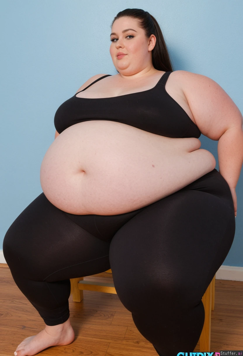 curvy, black yoga pants, overstretched fabric, black crop top, huge cleavage, (((((massive heavy bloated belly))))), (belly stretch marks), ((huge wide hips)), ((massive fat thighs)), morbidly obese, ((belly on lap)), ((belly rub)) (Side view)
