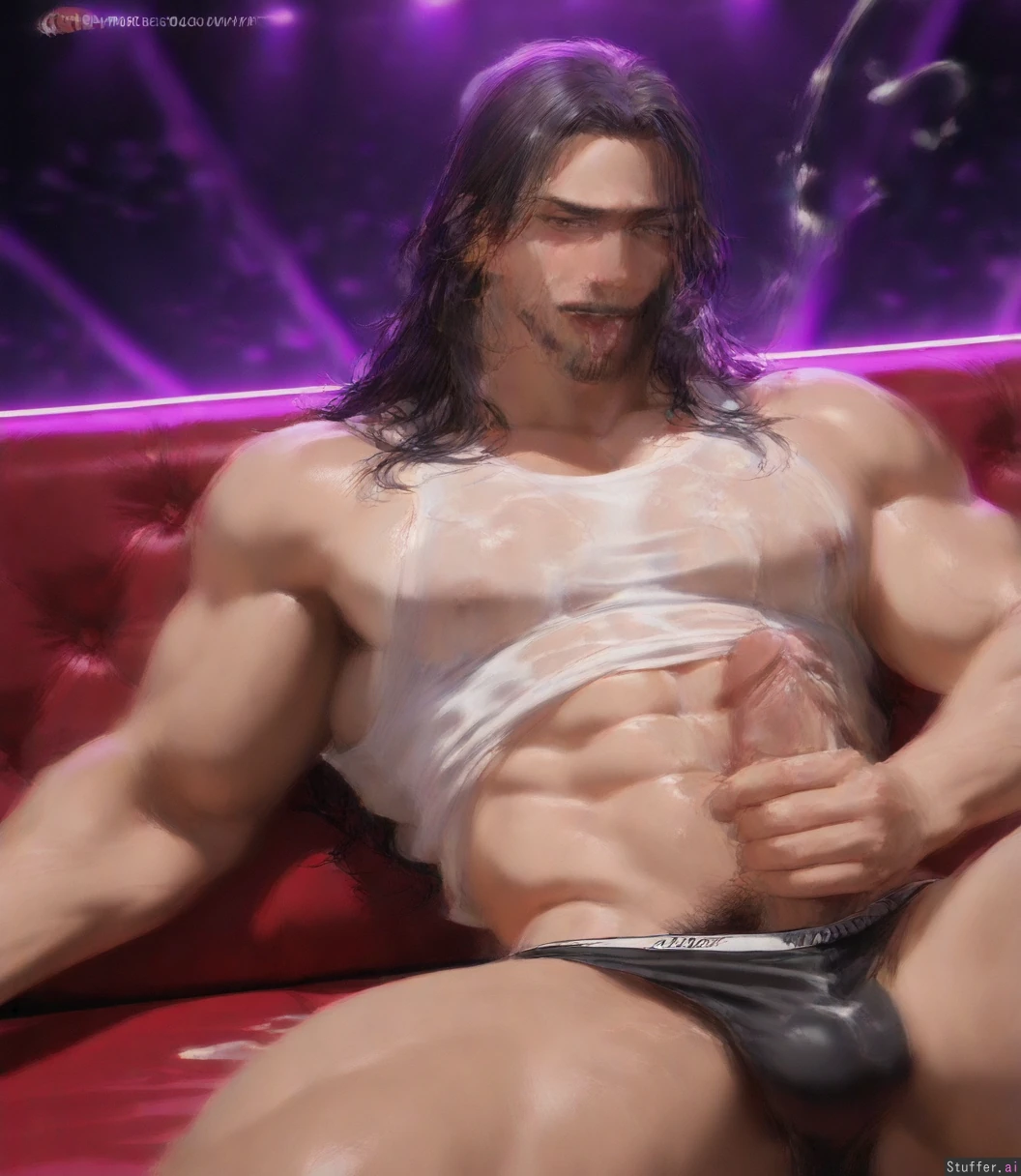 Solo male masturbates, 20yo, handsome face, (muscular), medium-long hair, clothes on, panties off, big dick, big pecs, sperm on clothes, cum on abs, cumshot, cum on face, tongue out, sleeveless semi-transparent shirt, reclines, stripper club, masterpiece, high_quality, perfect_light, realism, Ultra HD, best quality, detailed skin texture,