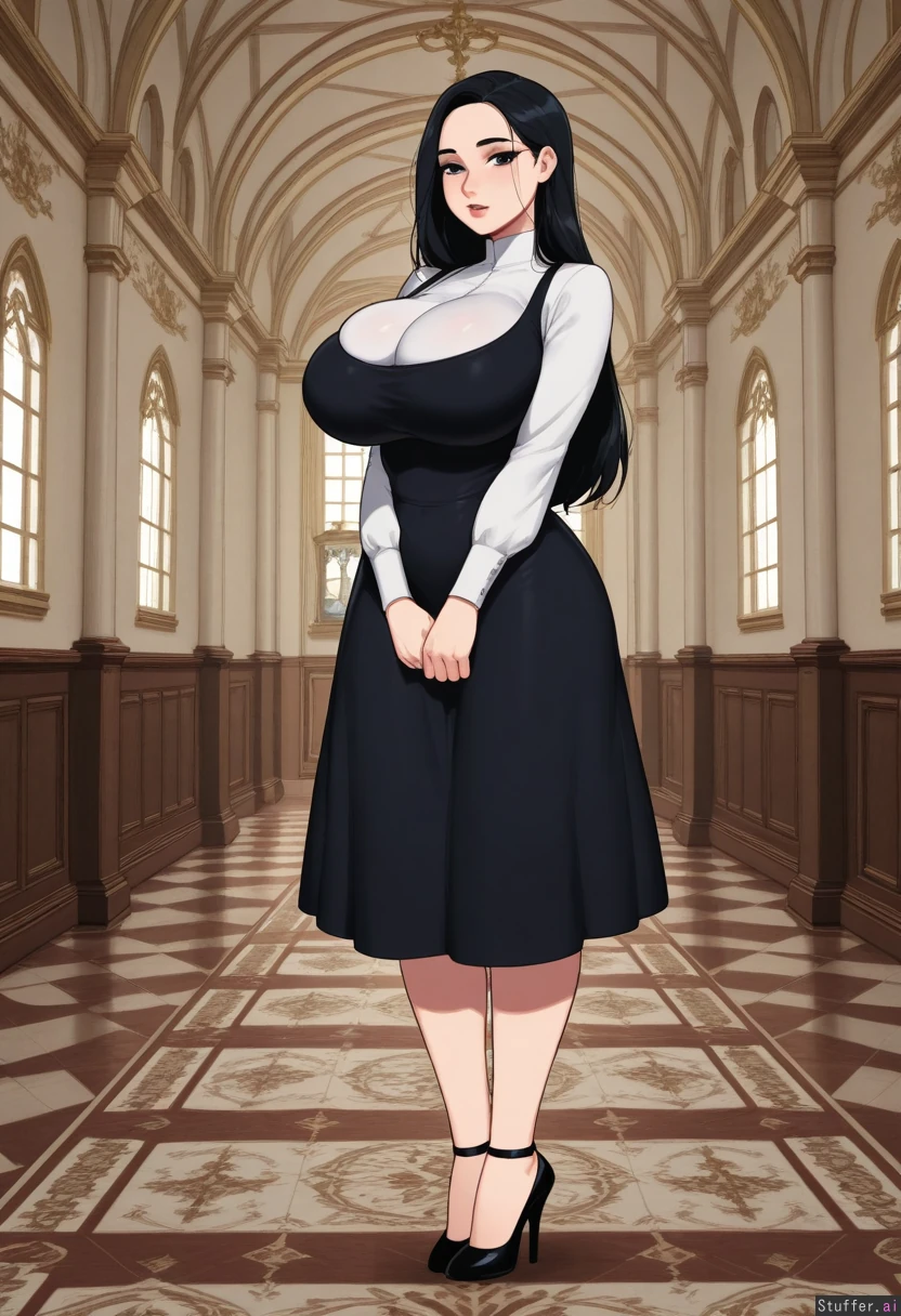 (masterpiece), (best quality), (1girl), (full_body), (detailed_eyes) krekkov(artists), KAMII MOMORU(artist), (mansion), (modern) (heiress), (black hair) (modest_dress), (heels) (skinny: 1), (hourglass_figure: 1.1), (big breasts :1.8)