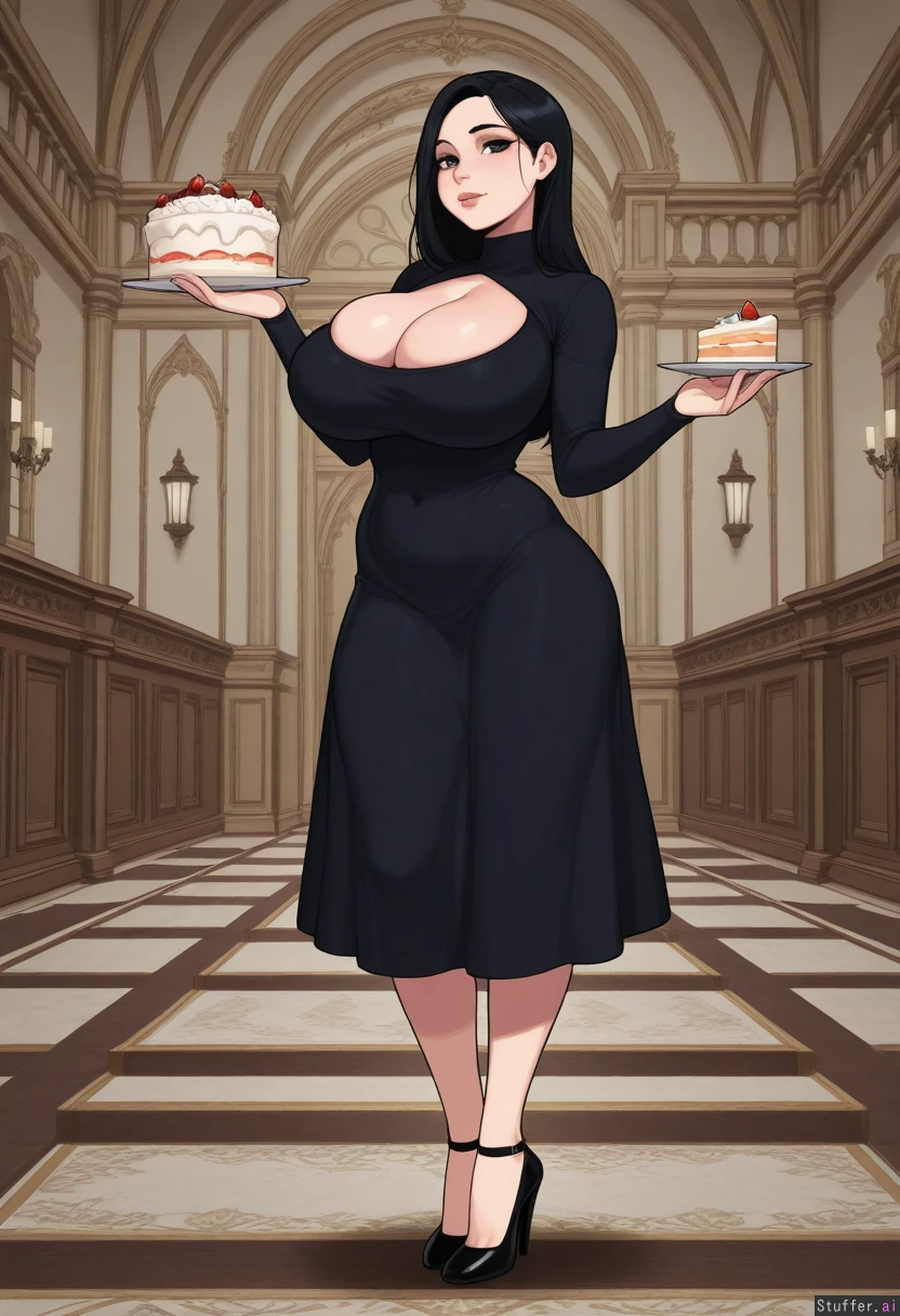 (masterpiece), (best quality), (1girl), (full_body), (detailed_eyes) krekkov(artists), KAMII MOMORU(artist), (mansion), (modern) (heiress), (black hair) (modest_dress), (heels) (skinny: 1), (hourglass_figure: 1.1), (big breasts :1.8) (cake in hand, eating cake) (soft tummy :1.1)