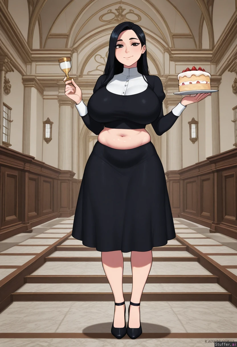 (masterpiece), (best quality), (1girl), (full_body), (detailed_eyes) krekkov(artists), KAMII MOMORU(artist), (mansion), (modern) (heiress), (black hair) (modest_dress), (heels) (skinny: 1), (hourglass_figure: 1.1), (big breasts :1.8) (cake in hand, eating cake) (soft tummy :1.5) (fat :1.1)