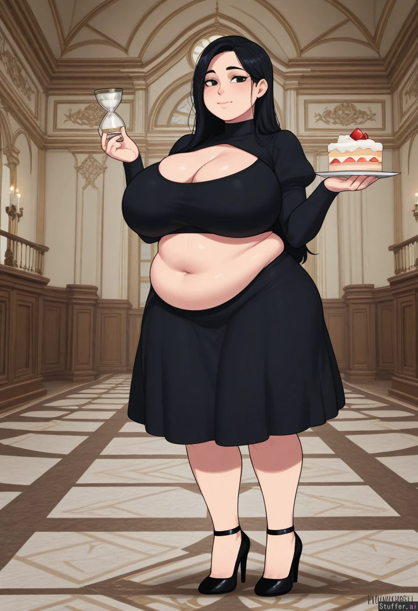 (masterpiece), (best quality), (1girl), (full_body), (detailed_eyes) krekkov(artists), KAMII MOMORU(artist), (mansion), (modern) (heiress), (black hair) (modest_dress), (heels) (skinny: 1), (hourglass_figure: 1.1), (big breasts :1.8) (cake in hand, eating cake) (soft tummy :1.5) (fat :1.5)