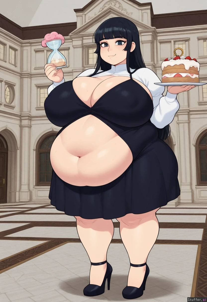 (masterpiece), (best quality), (1girl), (full_body), (detailed_eyes) krekkov(artists), KAMII MOMORU(artist), (mansion), (modern) (heiress), (black hair) (modest_dress), (heels) (skinny: 1), (hourglass_figure: 1.1), (big jiggly fat tits, big fat breasts :1.5) (cake in hand, eating cake) (big jiggly fat belly, soft tummy :1.5) (fat :1.5)