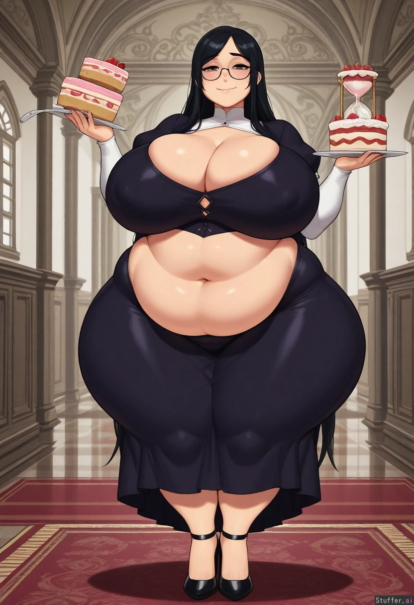 (masterpiece), (best quality), (1girl), (full_body), (detailed_eyes) krekkov(artists), KAMII MOMORU(artist), (mansion), (modern) (heiress), (black hair) (modest_dress), (heels) (extremely curvy :1.7) (skinny: 1), (hourglass_figure: 1.1), (big fat breasts :1.5) (cake in hand, eating cake) (big jiggly fat belly, soft tummy :1.5) (fat :1.5)