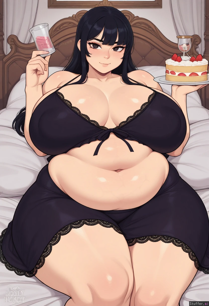 (masterpiece), (best quality), (1girl), (full_body), (detailed_eyes) krekkov(artists), KAMII MOMORU(artist), (mansion_bedroom), (modern), (heiress), (black hair) (slutty_nightdress) (extremely curvy :1.7) (skinny: 1), (hourglass_figure: 1.1), (big fat breasts :1.5) (cake in hand, eating cake) (big jiggly fat belly, soft tummy :1.5) (fat :1.5) (reclining_in_bed)