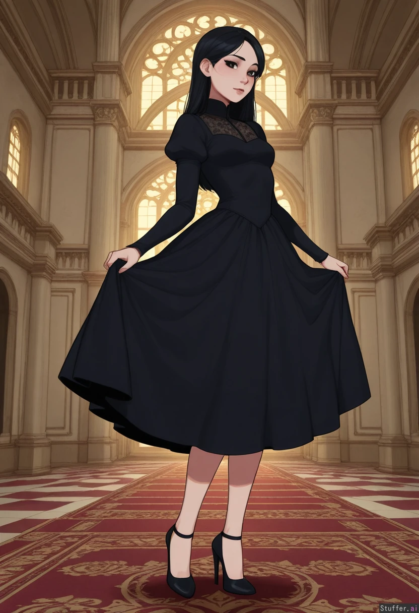 (masterpiece), (best quality), (1girl), (full_body), (detailed_eyes) krekkov(artists), KAMII MOMORU(artist), (mansion), (modern) (heiress), (black hair) (modest_dress), (heels) (skinny: 1), (hourglass_figure: 0.8), (small breasts: 1.0)