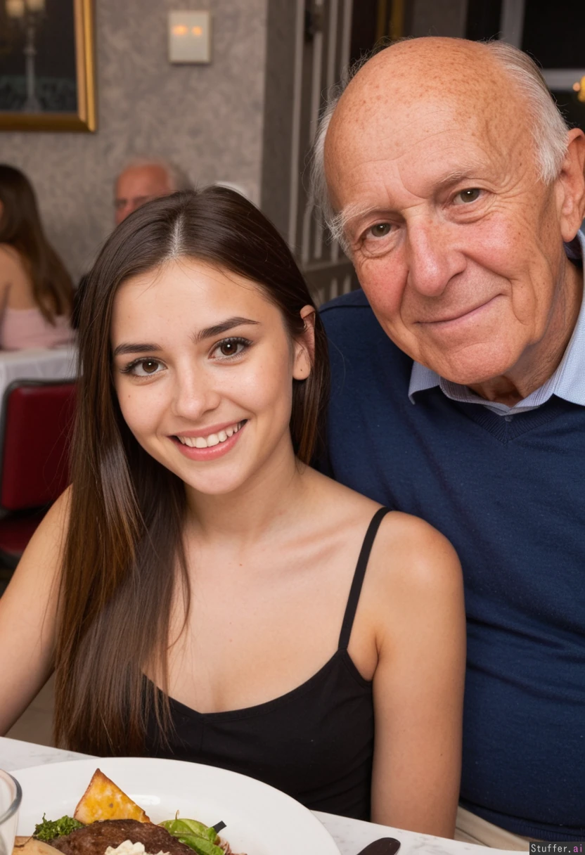 a 20 yo brunette woman on a date with an ugly 80 year old man at a romantic restaurant. They are looking at the camera and smiling.