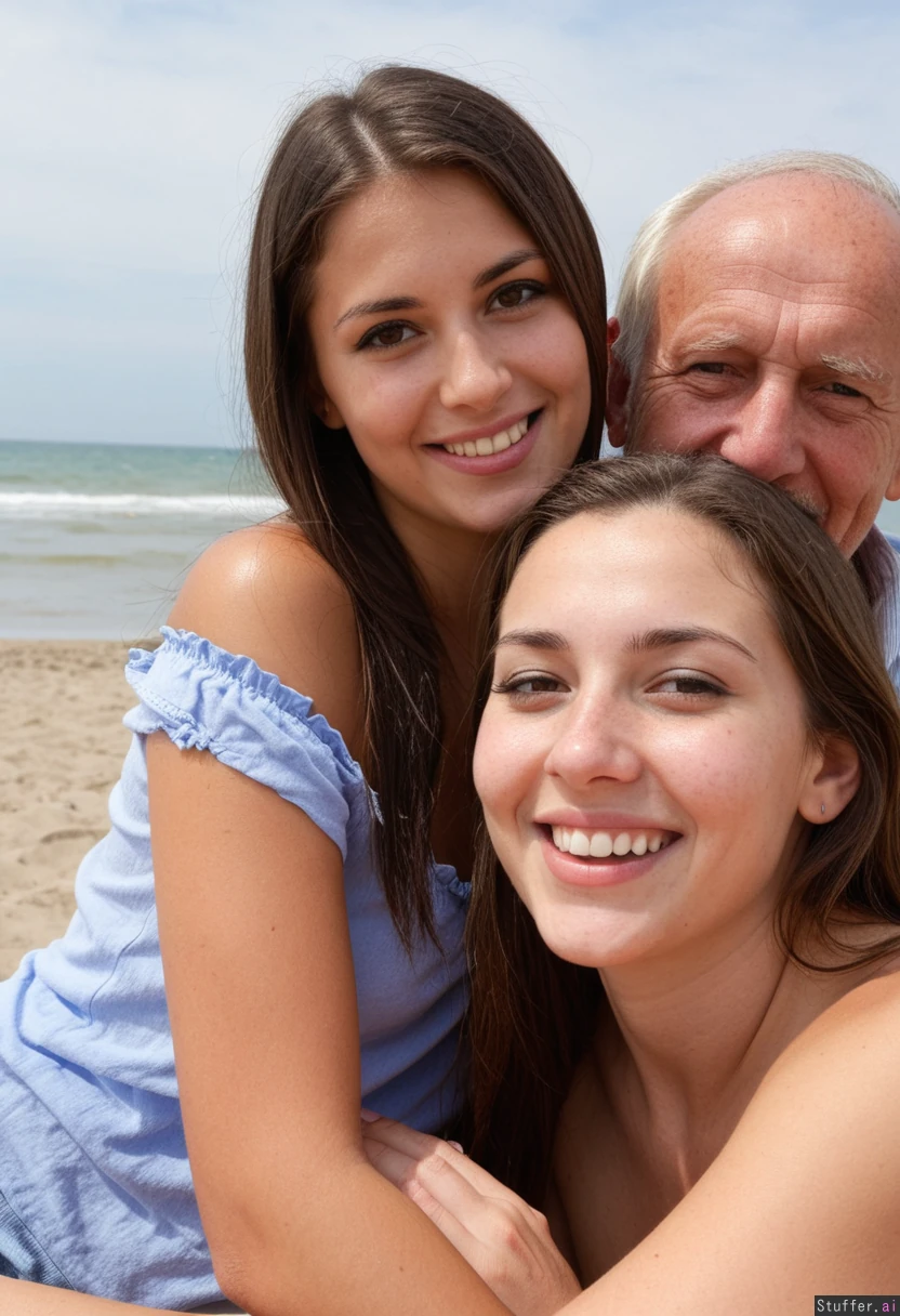 a 25 yo brunette woman on a date with an ugly 80 year old man at a romantic beach. They are looking at the camera and smiling.