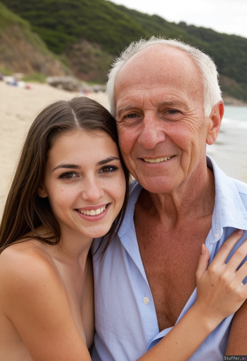 a 25 yo brunette woman on a date with an ugly 80 year old man at a romantic beach. They are looking at the camera and smiling.