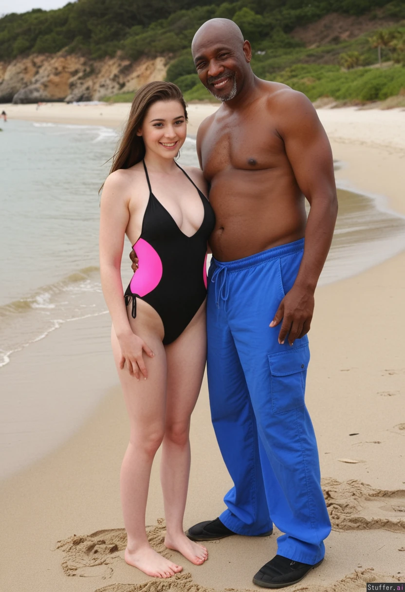 a fully clothed 25 yo brunette woman on a date with an ugly 80 year old black man at a romantic beach. They are looking at the camera and smiling. full body image. Wearing swimsuit. Medium breasts. He has huge bulge in his pants.