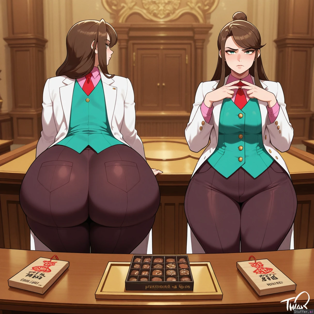 perfect anatomy, beautiful face, beautiful eyes, Masterpiece, best_quality, beautiful, vibrant colors, dim light, (1girl), alone, Tweedabop(artist), betterwithsalt(artist), nyantcha(artist), perfect hands, front view, Ema_Skye(Ace_attorney), dynamic pose, teal_eyes, white_coat, pink_shirt, green_vest_with_gold_buttons, brown_pants, capri_pants, red_tie, teal_eyes, annoyed, pouting, eating_chocolate_bar, courtroom, ((huge fat hips, huge fat ass, huge fat thighs, overweight):1.0)