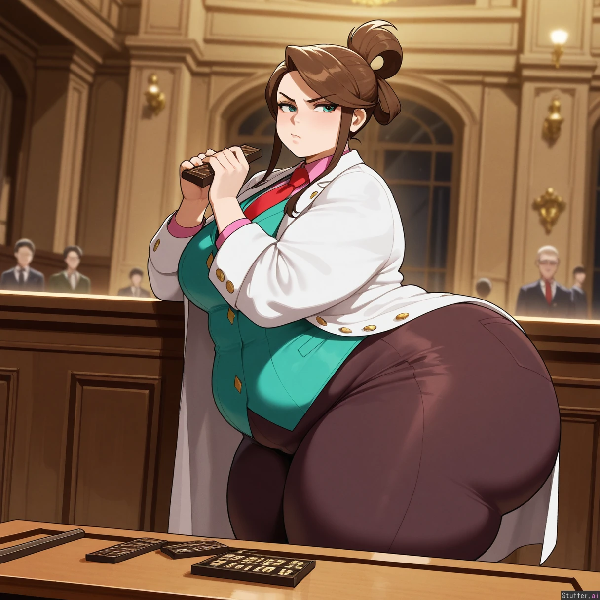 perfect anatomy, beautiful face, beautiful eyes, Masterpiece, best_quality, beautiful, vibrant colors, dim light, (1girl), alone, Tweedabop(artist), betterwithsalt(artist), nyantcha(artist), perfect hands, front view, Ema_Skye(Ace_attorney), dynamic pose, teal_eyes, white_coat, pink_shirt, green_vest_with_gold_buttons, brown_pants, capri_pants, red_tie, teal_eyes, annoyed, pouting, eating_chocolate_bar, courtroom, ((huge obese hips, huge obese ass, huge obese thighs, overweight):1.0)
