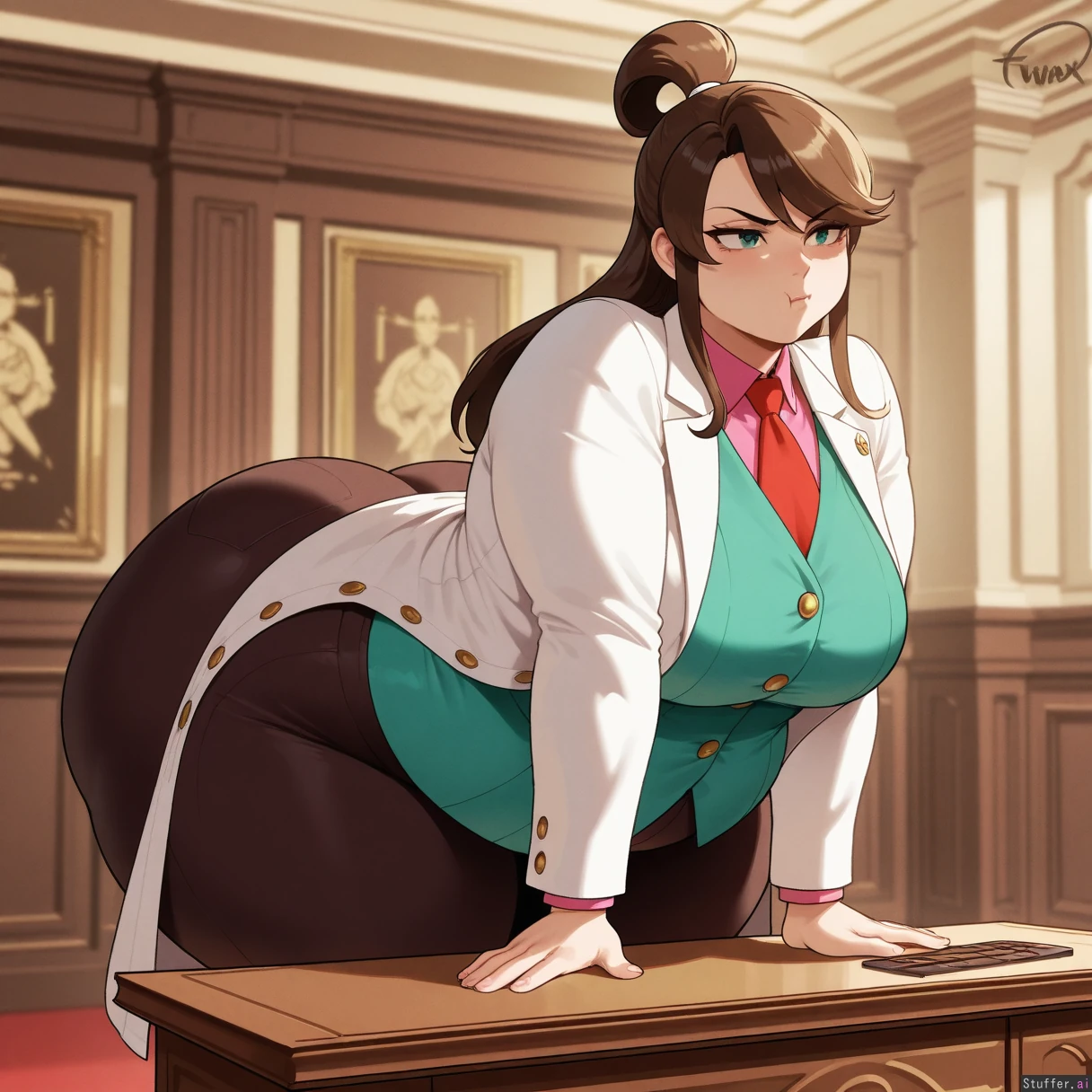 perfect anatomy, beautiful face, beautiful eyes, Masterpiece, best_quality, beautiful, vibrant colors, dim light, (1girl), alone, Tweedabop(artist), betterwithsalt(artist), nyantcha(artist), perfect hands, front view, Ema_Skye(Ace_attorney), dynamic pose, teal_eyes, white_coat, pink_shirt, green_vest_with_gold_buttons, brown_pants, capri_pants, red_tie, teal_eyes, annoyed, pouting, eating_chocolate_bar, courtroom, (huge obese hips, huge obese ass, huge obese thighs), (overweight:1.0)