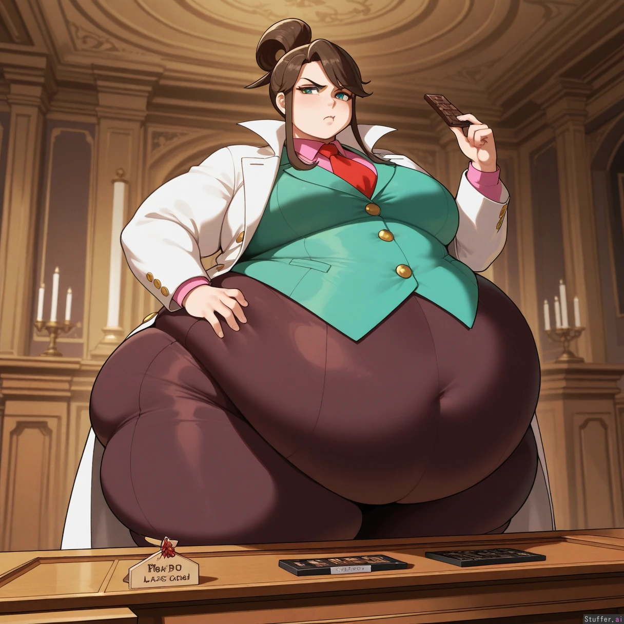 perfect anatomy, beautiful face, beautiful eyes, Masterpiece, best_quality, beautiful, vibrant colors, dim light, (1girl), alone, Tweedabop(artist), betterwithsalt(artist), nyantcha(artist), perfect hands, front view, Ema_Skye(Ace_attorney), dynamic pose, teal_eyes, white_coat, pink_shirt, green_vest_with_gold_buttons, brown_pants, capri_pants, red_tie, teal_eyes, annoyed, pouting, eating_chocolate_bar, courtroom, (huge obese hips, huge obese ass, huge obese thighs, huge obese belly), (morbidly obese:1.5)