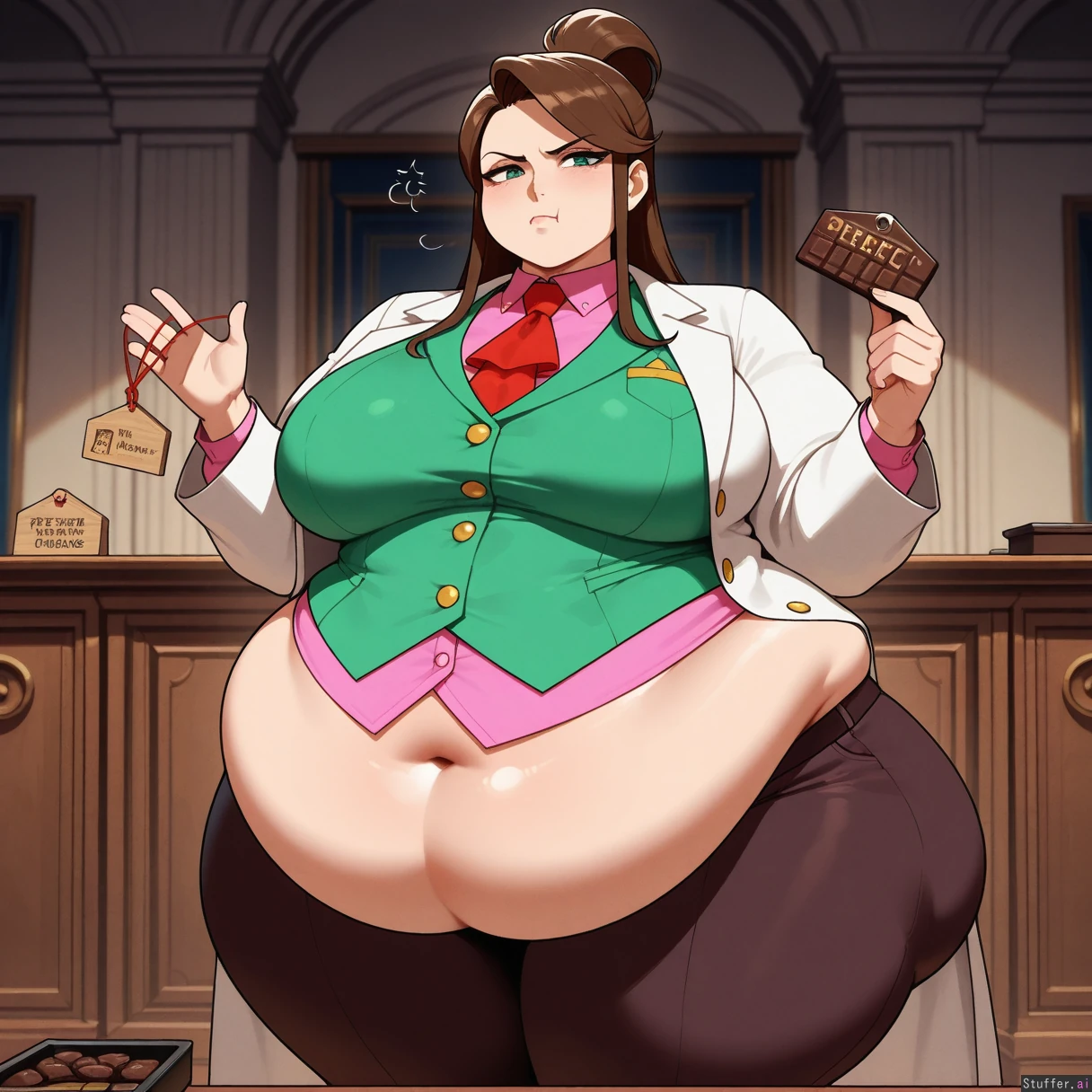 perfect anatomy, beautiful face, beautiful eyes, Masterpiece, best_quality, beautiful, vibrant colors, dim light, (1girl), alone, Tweedabop(artist), betterwithsalt(artist), nyantcha(artist), perfect hands, front view, Ema_Skye(Ace_attorney), dynamic pose, teal_eyes, white_coat, pink_shirt, green_vest_with_gold_buttons, brown_pants, capri_pants, red_tie, teal_eyes, annoyed, pouting, eating_chocolate_bar, courtroom, ((huge obese hips, huge obese ass, huge obese thighs, huge obese belly):1.0)