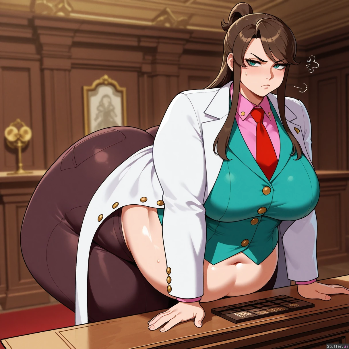 perfect anatomy, beautiful face, beautiful eyes, Masterpiece, best_quality, beautiful, vibrant colors, dim light, (1girl), alone, Tweedabop(artist), betterwithsalt(artist), nyantcha(artist), perfect hands, front view, Ema_Skye(Ace_attorney), dynamic pose, teal_eyes, white_coat, pink_shirt, green_vest_with_gold_buttons, brown_pants, capri_pants, red_tie, teal_eyes, annoyed, pouting, eating_chocolate_bar, courtroom, (huge obese hips, huge obese ass, huge obese thighs, huge obese belly), (overweight:1.0)