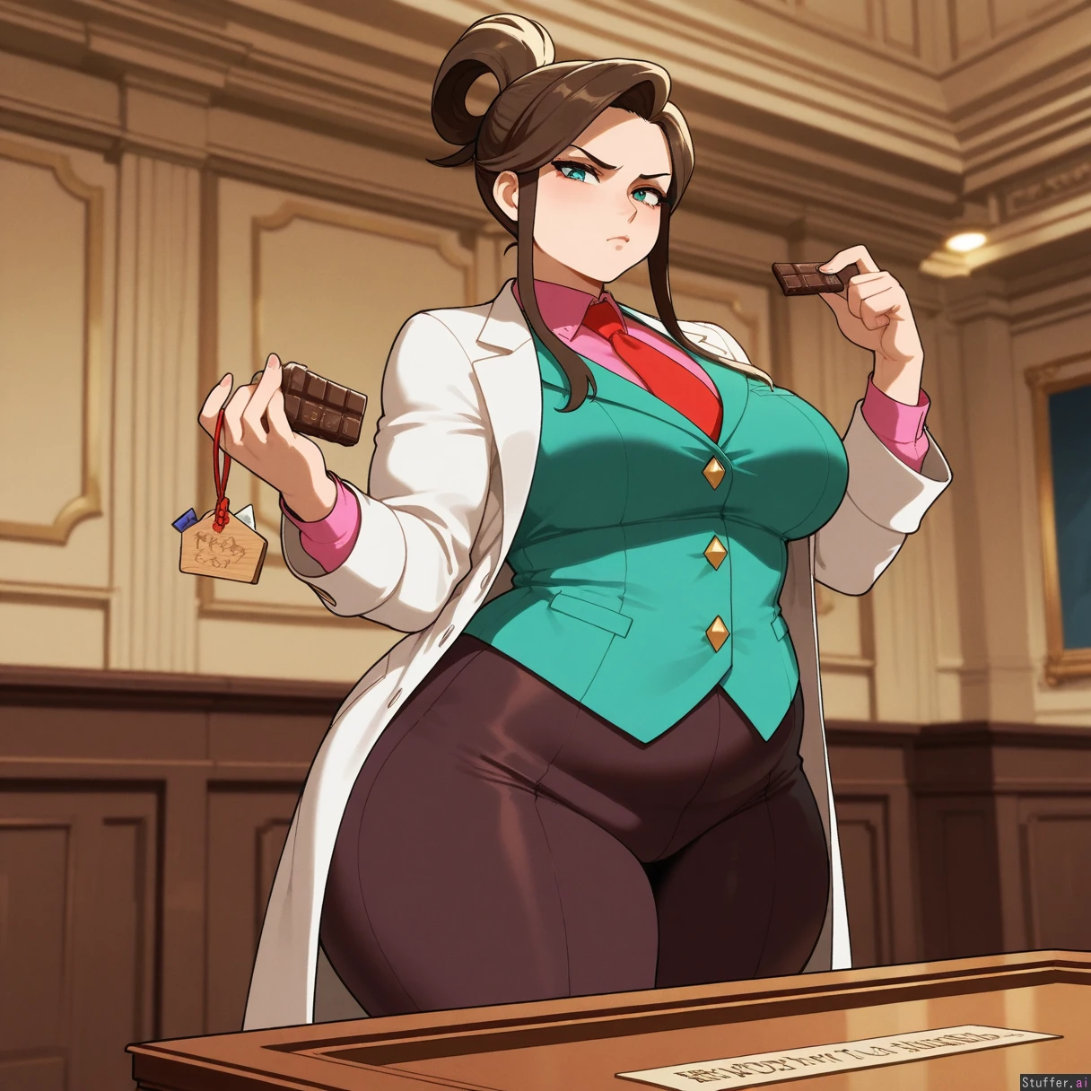 perfect anatomy, beautiful face, beautiful eyes, Masterpiece, best_quality, beautiful, vibrant colors, dim light, (1girl), alone, Tweedabop(artist), betterwithsalt(artist), nyantcha(artist), perfect hands, front view, Ema_Skye(Ace_attorney), dynamic pose, teal_eyes, white_coat, pink_shirt, green_vest_with_gold_buttons, brown_pants, capri_pants, red_tie, teal_eyes, annoyed, pouting, eating_chocolate_bar, courtroom, (wide hips, huge obese ass, fat thighs), (overweight:1.0)