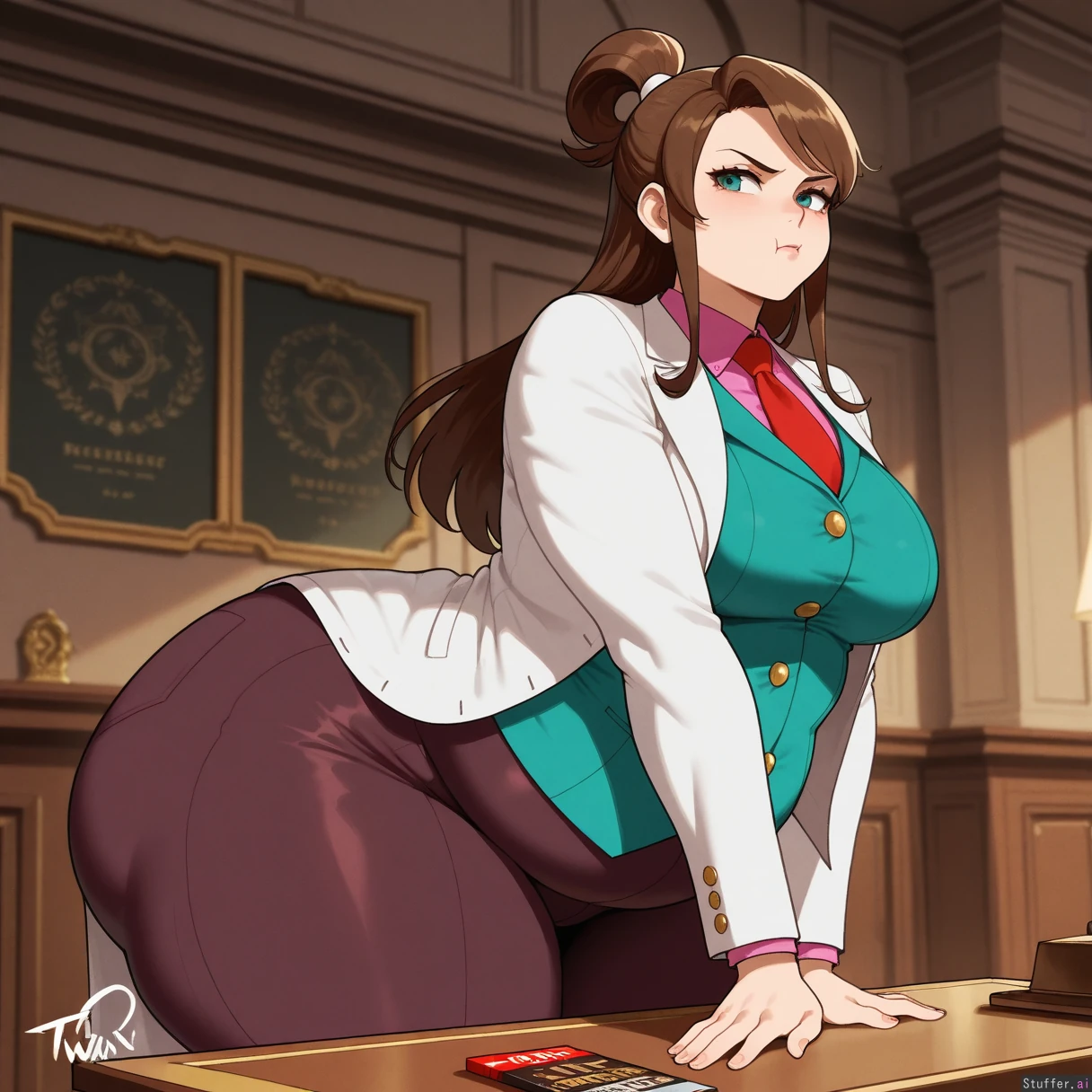 perfect anatomy, beautiful face, beautiful eyes, Masterpiece, best_quality, beautiful, vibrant colors, dim light, (1girl), alone, Tweedabop(artist), betterwithsalt(artist), nyantcha(artist), perfect hands, front view, Ema_Skye(Ace_attorney), dynamic pose, teal_eyes, white_coat, pink_shirt, green_vest_with_gold_buttons, brown_pants, capri_pants, red_tie, teal_eyes, annoyed, pouting, eating_chocolate_bar, courtroom, (wide hips, huge obese ass, fat thighs), (overweight:1.75)