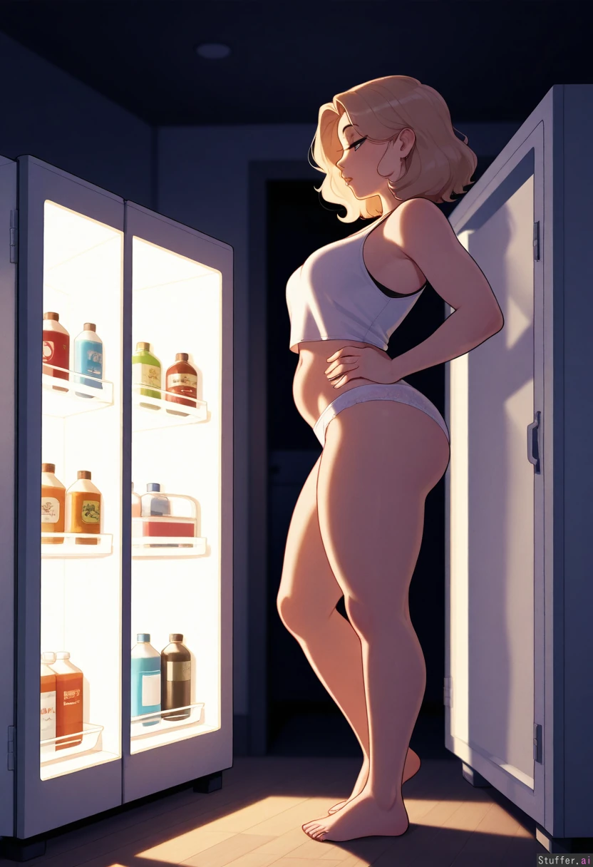 (pudgeruffian(artist)), (nyantcha(artist)), solo, 1girl, masterpiece, best quality, best anatomy, cool colors, (open fridge, fridge light), (dark room), kitchen, standing straight, full body, (side view), nighttime, looking forward, hands on hips, profile, (Blonde hair, curtained hair, melina hair, medium hair), ((eyes half closed)), eyeshadow, (luscious big lips), mature, black eyes, horny, hungry, Thin, belly, ((hyper obese, way too fat, enormous round obese belly:0.0), (huge obese hips, huge fat thighs, fat arms, thick fat rolls:0.0):0.0), huge hips, big ass, (white lacy panties, white tank top, barefoot)