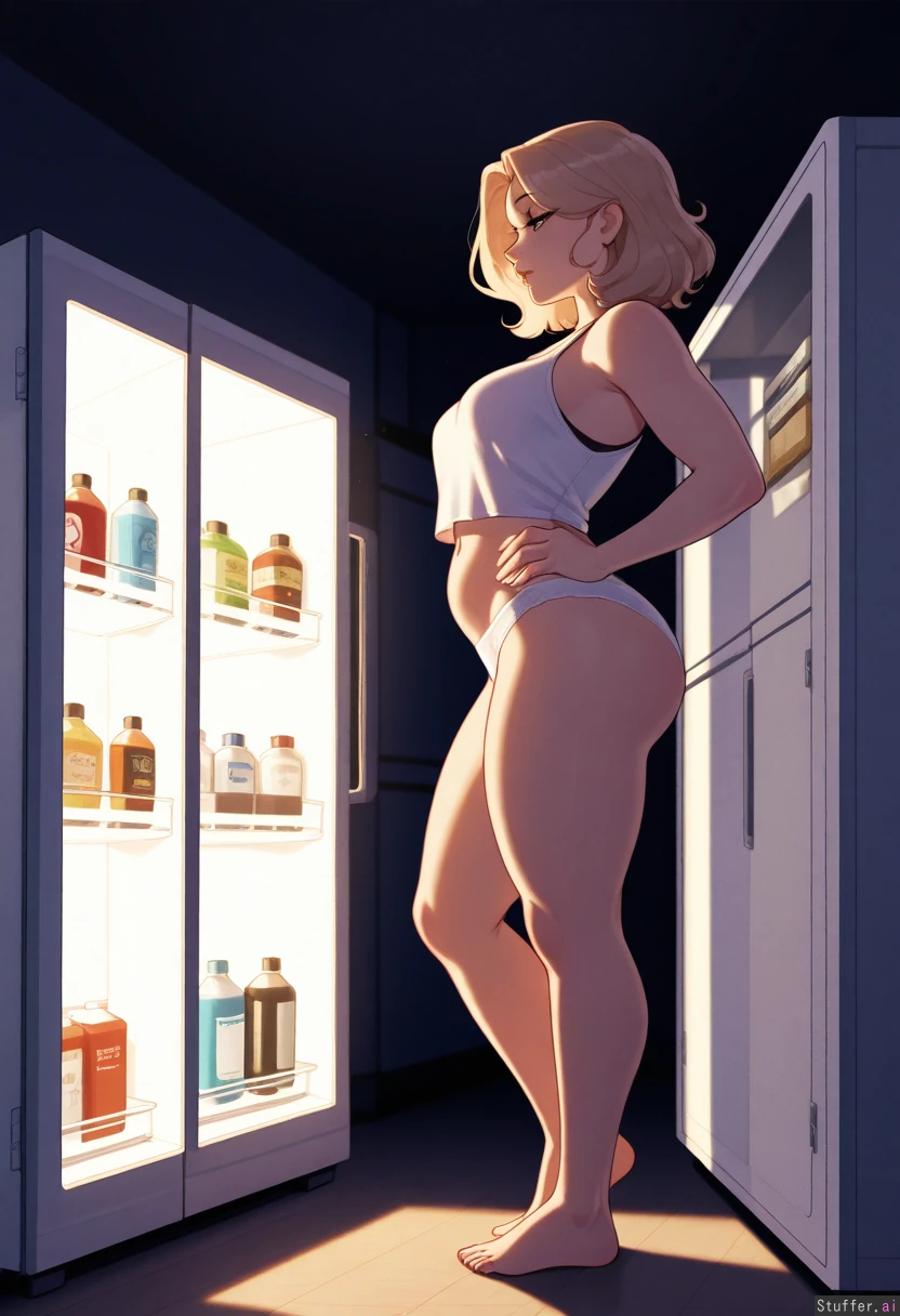(pudgeruffian(artist)), (nyantcha(artist)), solo, 1girl, masterpiece, best quality, best anatomy, cool colors, (open fridge, fridge light), (dark room), kitchen, standing straight, full body, (side view), nighttime, looking forward, hands on hips, profile, (Blonde hair, curtained hair, melina hair, medium hair), ((eyes half closed)), eyeshadow, (luscious big lips), mature, black eyes, horny, hungry, Thin, belly, ((hyper obese, way too fat, enormous round obese belly:0.0), (huge obese hips, huge fat thighs, fat arms, thick fat rolls:0.0):0.0), huge hips, big ass, thick thighs, (white lacy panties, white tank top, barefoot)