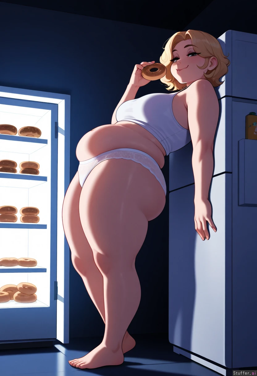 (pudgeruffian(artist)), (nyantcha(artist)), solo, 1girl, masterpiece, best quality, best anatomy, cool colors, (open fridge, fridge light), (dark room), kitchen, standing, full body, side view, nighttime, looking down, slightly leaning back, on wall, ((Eating donut)), (chewing cheek), (smile), (Blonde hair, curtained hair, melina hair, medium hair), ((eyes half closed)), eyeshadow, (luscious big lips), mature, black eyes, horny, hungry, Belly, ((hyper obese, way too fat, enormous round obese belly:0.0), (huge obese hips, huge fat thighs, fat arms, thick fat rolls:1.0):0.5), huge hips, big ass, thick thighs, (white lacy panties, white tank top, barefoot)