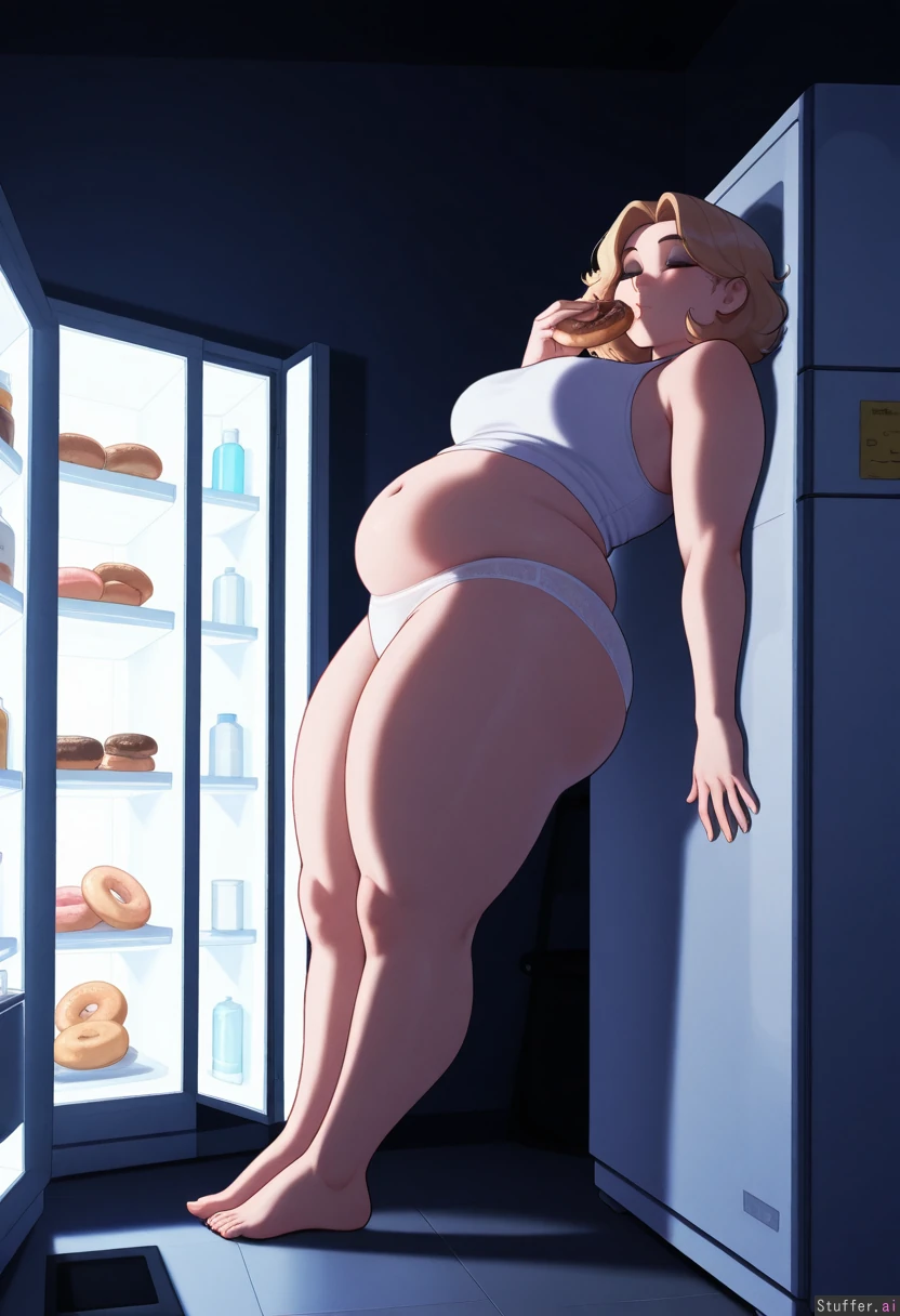 (pudgeruffian(artist)), (nyantcha(artist)), solo, 1girl, masterpiece, best quality, best anatomy, cool colors, (open fridge, fridge light), (dark room), kitchen, standing, full body, side view, nighttime, looking down, slightly leaning back, on wall, ((Eating donut)), (chewing cheek), (Blonde hair, curtained hair, melina hair, medium hair), ((eyes closed)), eyeshadow, (luscious big lips), mature, black eyes, horny, hungry, Chubby Belly, ((hyper obese, way too fat, enormous round obese belly:0.0), (huge obese hips, huge fat thighs, fat arms, thick fat rolls:1.0):1.0), huge hips, (big ass), thick thighs, (white lacy panties, white tank top, barefoot)